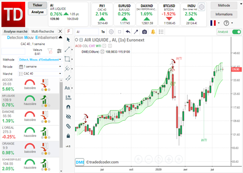 Ainsi, lorsque le mouvement d’emballement est détecté sur l’une des valeurs de votre portefeuille, vous êtes immédiatement prévenu. Le mouvement est suivi par un seuil d’invalidation calculé en fonction de la volatilité propre à chacune des valeurs. (