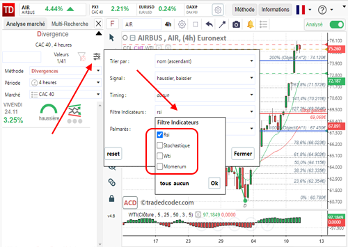 Ce nouveau système de filtrage permet par exemple , pour les divergences de sélectionner un seul indicateur de filtrage tel que le RSI parmis les 4 indicateurs disponibles.